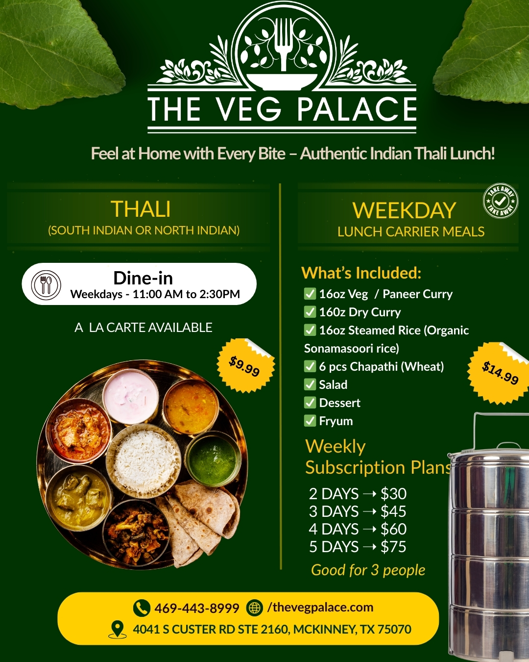 The Veg Palace McKinney – Affordable Indian Veg Dine-In Thali & Takeaway Meal Subscriptions