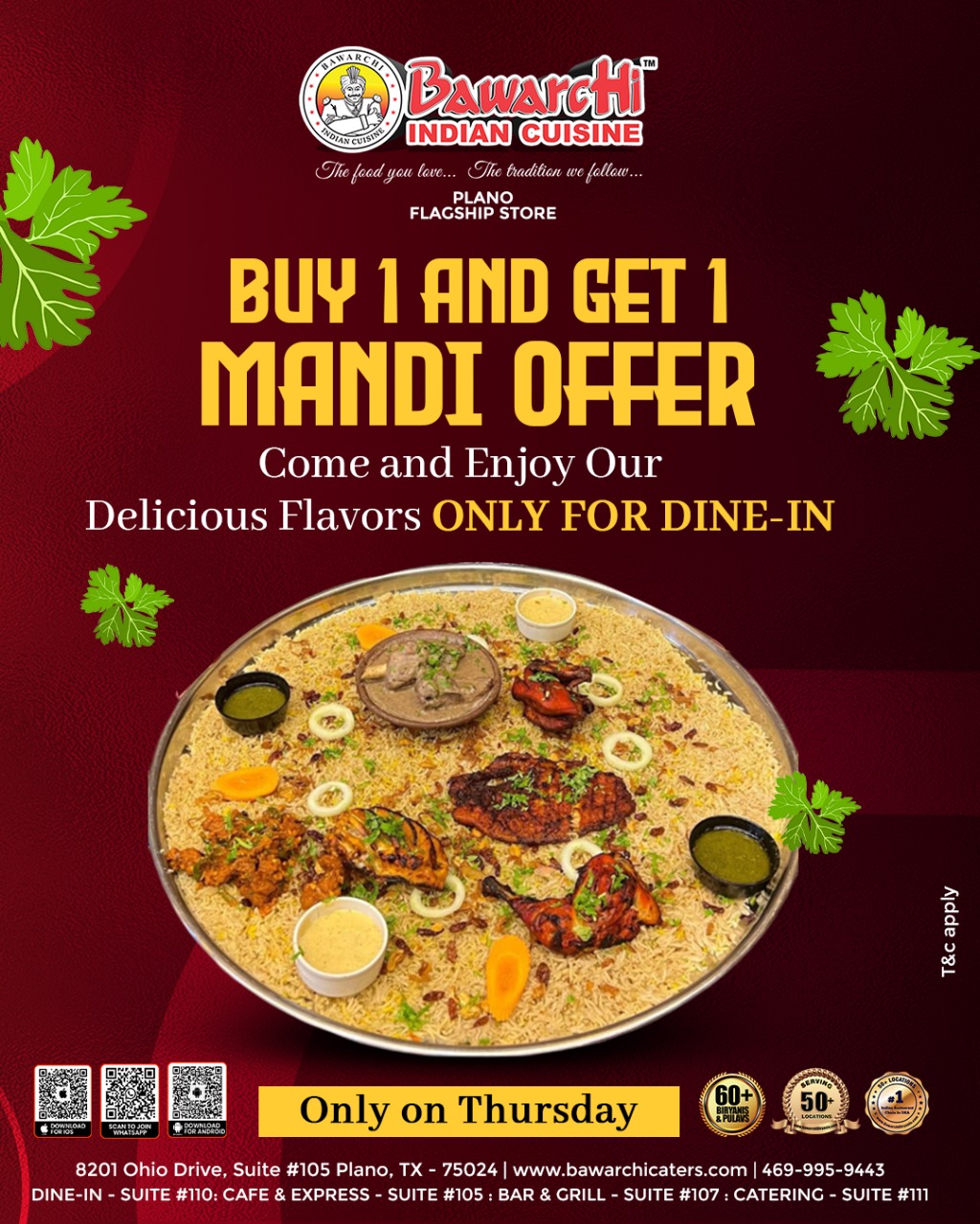 Craving authentic Indian flavors? Don’t miss out on our exclusive Thursday Mandi offer at Bawarchi Indian Cuisine - Plano Flagship Store!