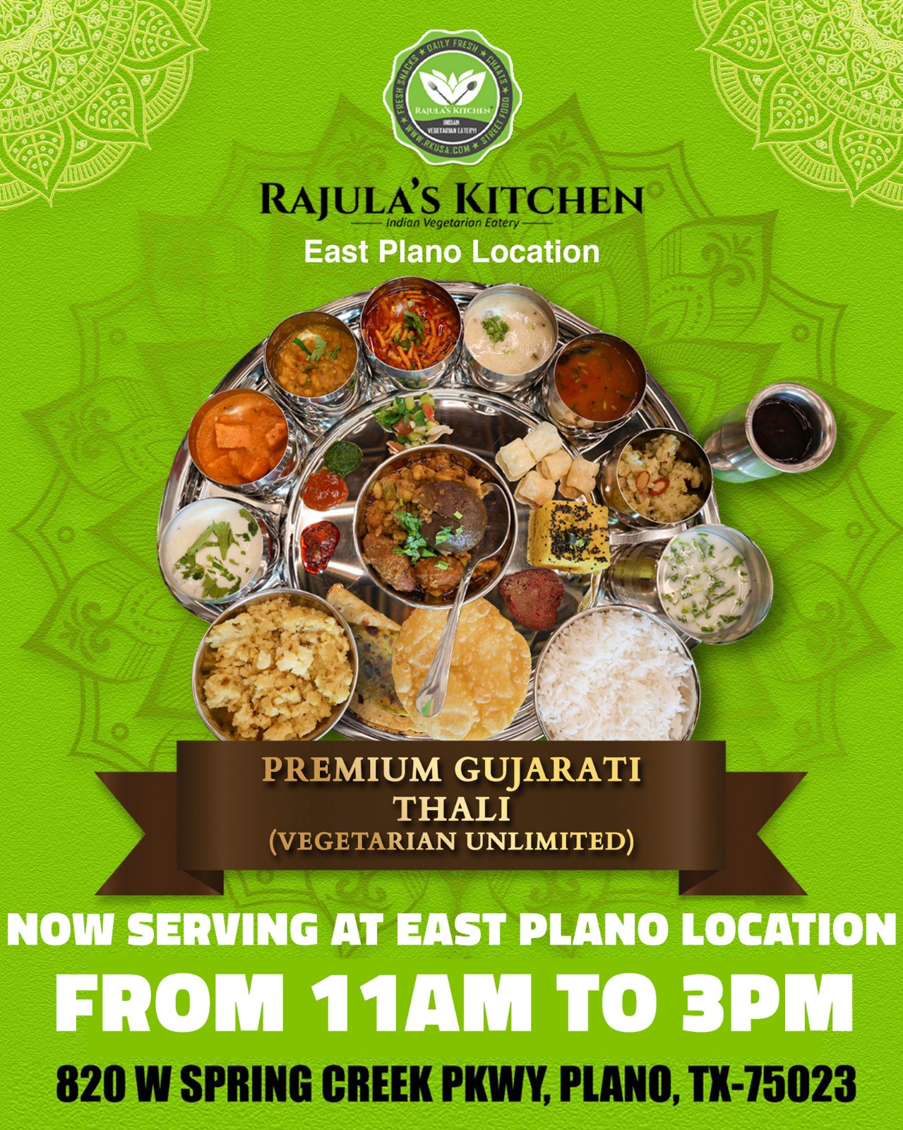 Craving authentic Indian flavors? Look no further! Rajula’s Kitchen is now serving its Premium Gujarati Thali – Unlimited Vegetarian Meal at our brand-new East Plano location. Indulge in a traditional Indian lunch experience filled with a variety of fresh, flavorful, and homestyle dishes straight from Gujarat!