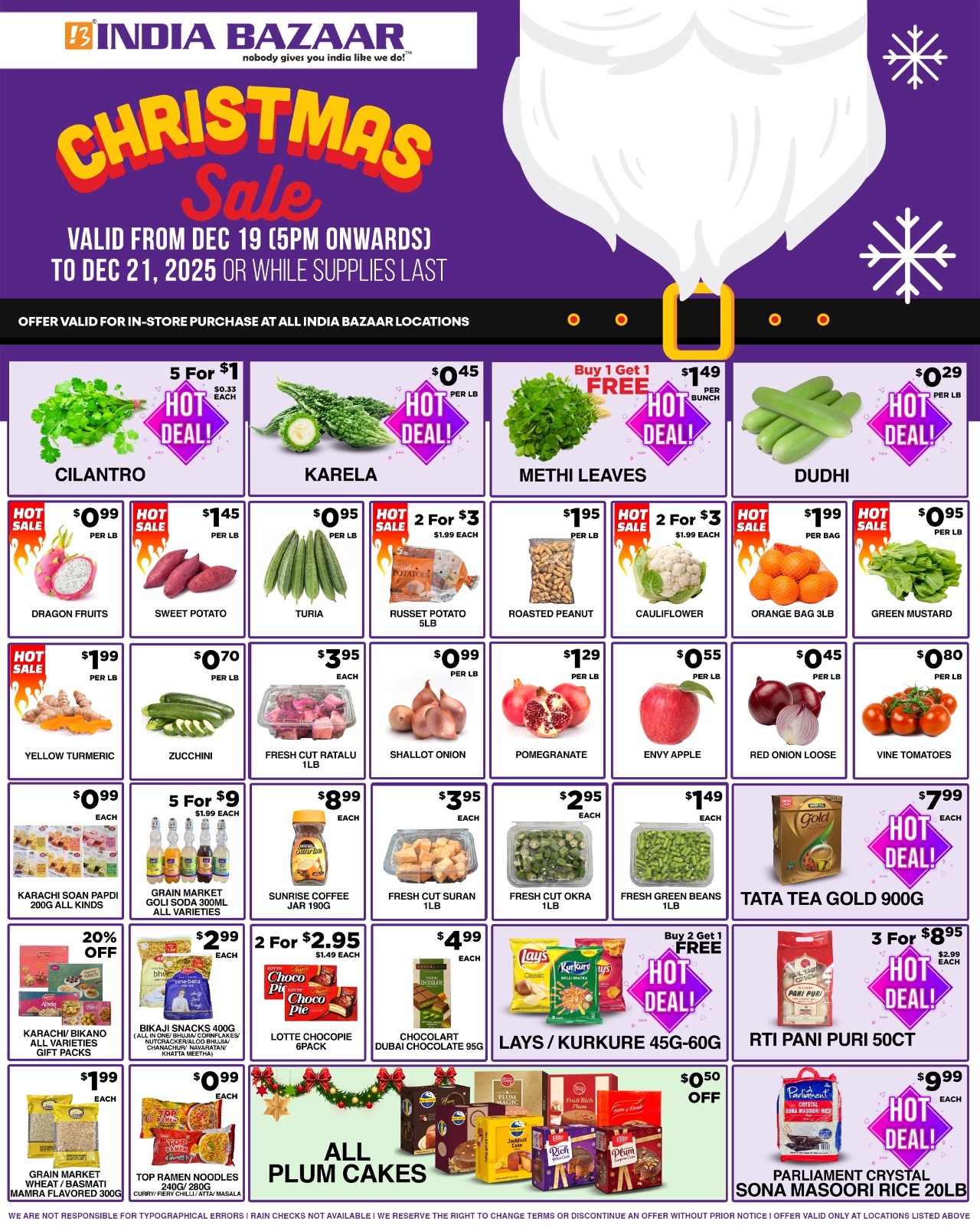 Fresh Produce Items: Cilantro, Karela, Methi Leaves, Dudhi, Dragon Fruit, Sweet Potato, Turia, Russet Potato, Roasted Peanut, Cauliflower, Orange Bag, Green Mustard, Yellow Turmeric, Zucchini, Fresh Cut Ratlou, Shallot Onion, Pomegranate, Envy Apple, Red Onion, Vine Tomatoes. Grocery & Packaged Food Items: Karachi Soan Papdi, Grain Market Wheat Flour, Sunrise Coffee, Fresh Cut Suran, Fresh Cut Okra, Fresh Green Beans, Tata Tea Gold, Karachi Bikano Varieties Gift Packs, Bikaji Snacks, Lotte Choco Pie, Chocolat Dubai Chocolate, Lays, Kurkure, RTI Pani Puri. Bakery & Cakes: All Plum Cakes. Rice: Parliament Crystal Sona Masoori Rice.