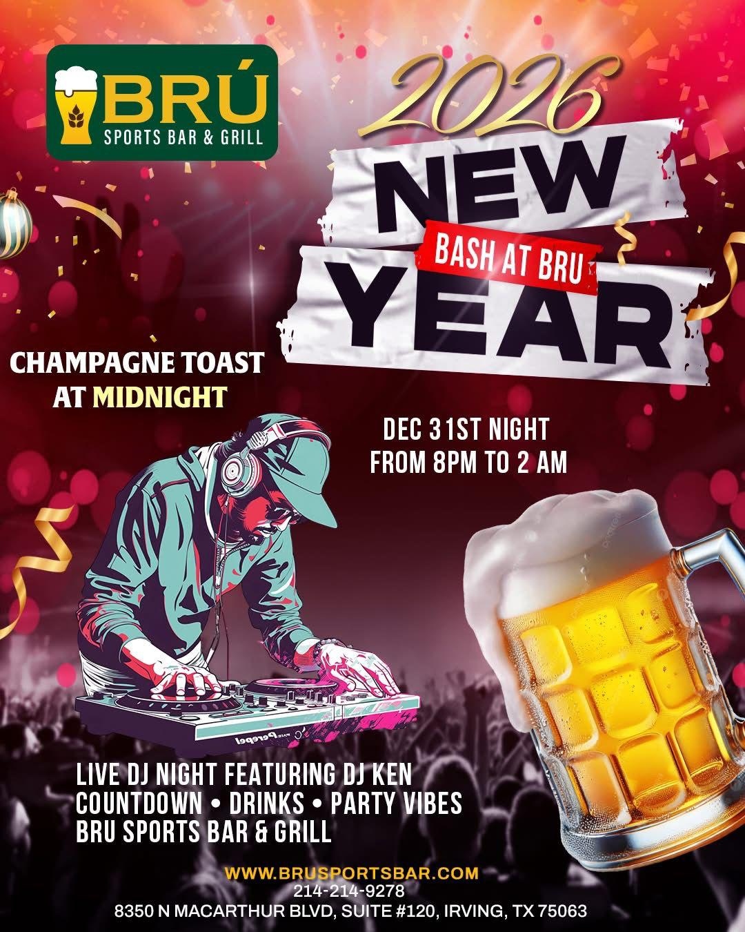 Welcome New Year 2026 with high-energy celebrations at BRU Sports Bar & Grill, one of Irving, Texas’s top destinations for nightlife and entertainment. Join us on December 31st night from 8:00 PM to 2:00 AM for an unforgettable New Year bash filled with music, drinks, and party vibes.