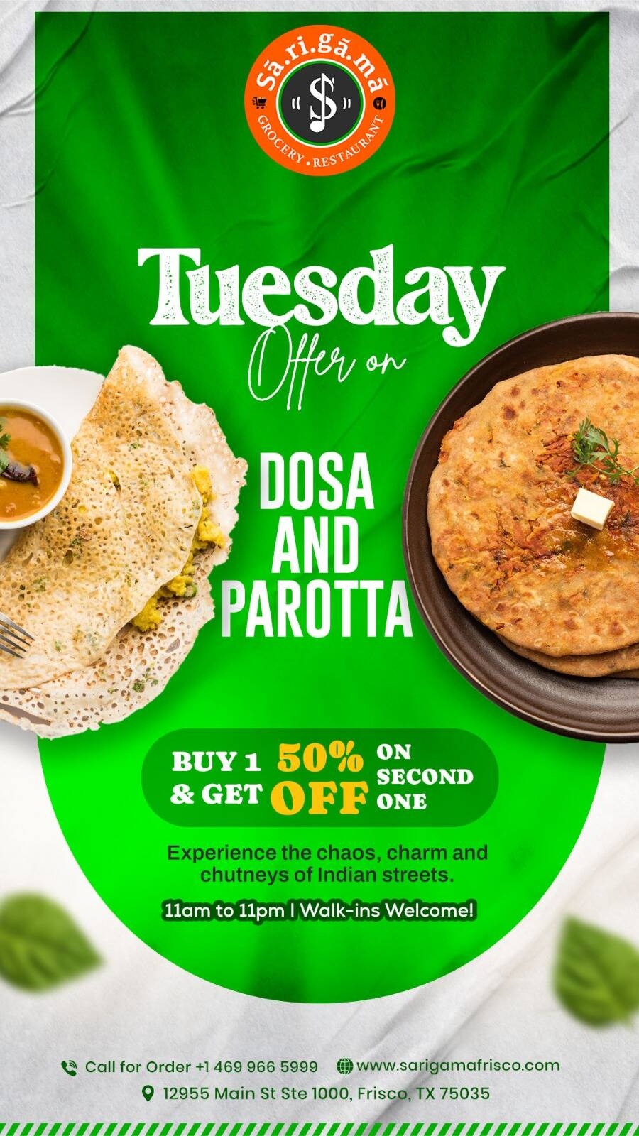 Make your Tuesdays extra special at Sarigama Frisco with an exclusive dine-in offer inspired by the vibrant flavors of Indian street food. Enjoy a delicious Indian meal experience with traditional tastes, comforting textures, and freshly prepared accompaniments that bring the charm of Indian streets straight to your table.