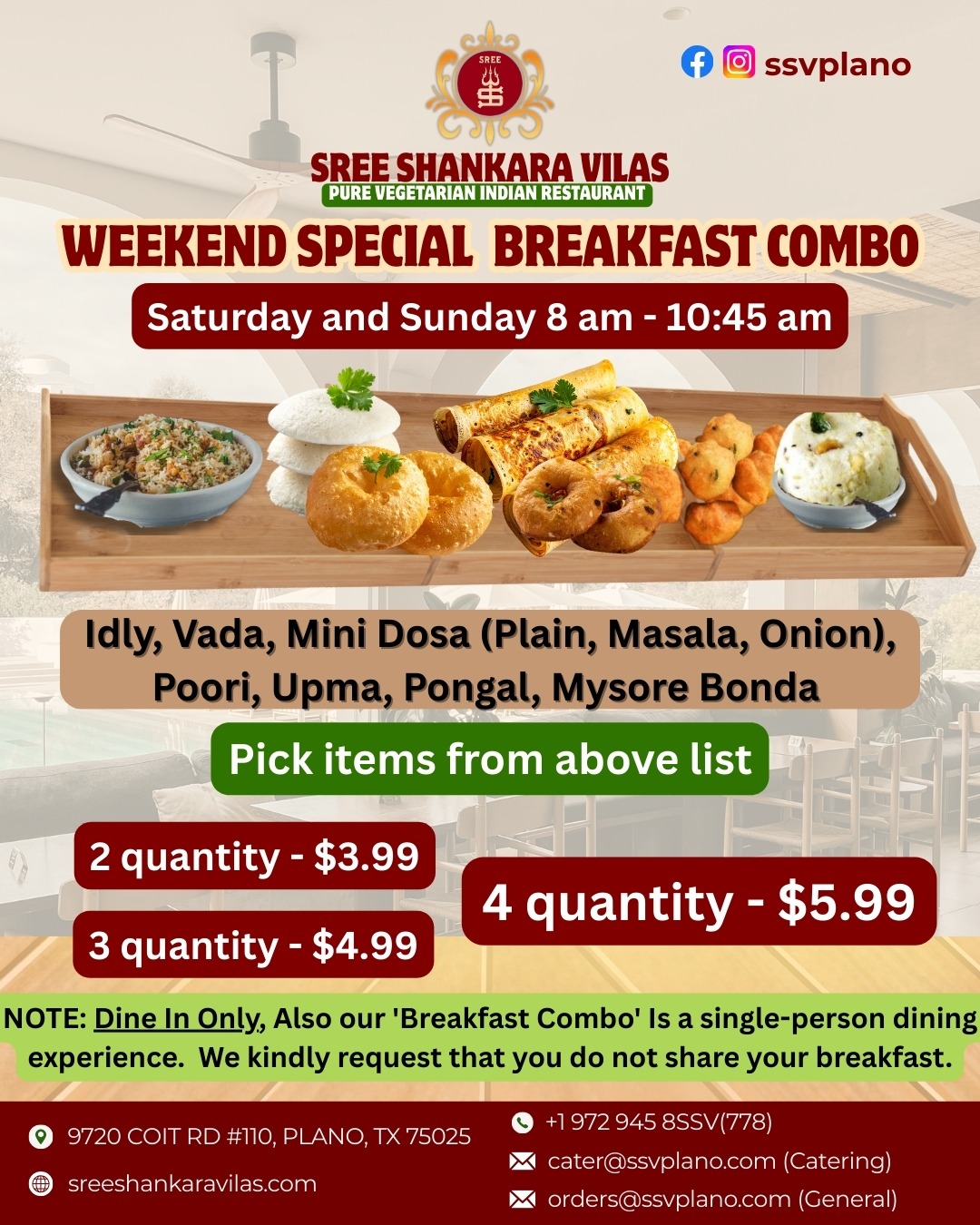 Start your weekend with a delicious and authentic South Indian breakfast at Sree Shankara Vilas. Our Weekend Special Breakfast Combo is perfect for anyone craving traditional vegetarian flavors at an unbeatable price.