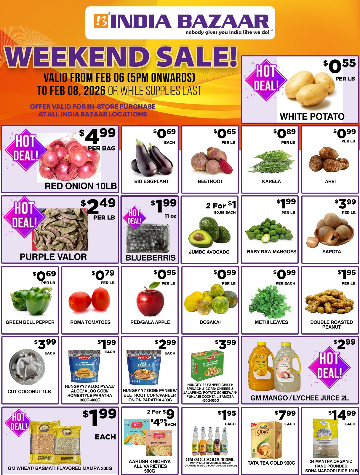 India Bazaar brings you exciting Weekend Sale deals from February 6 to February 8, 2026 (starting 5 PM). Shop fresh fruits, vegetables, groceries, frozen foods, and beverages at unbeatable prices across all India Bazaar locations. Enjoy hot deals on staples like potatoes, onions, mangoes, avocados, apples, parathas, samosas, juices, tea, and more. These in-store-only offers are available while supplies last, making it the perfect time to stock up on everyday essentials and fresh produce at great value.