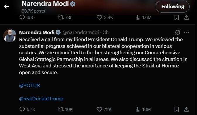 In a post on X, Modi said the two leaders reviewed progress in bilateral cooperation across multiple sectors and reaffirmed their commitment to strengthening the Comprehensive Global Strategic Partnership between India and the United States. The conversation lasted approximately 40 minutes and focused on both strategic and regional developments.