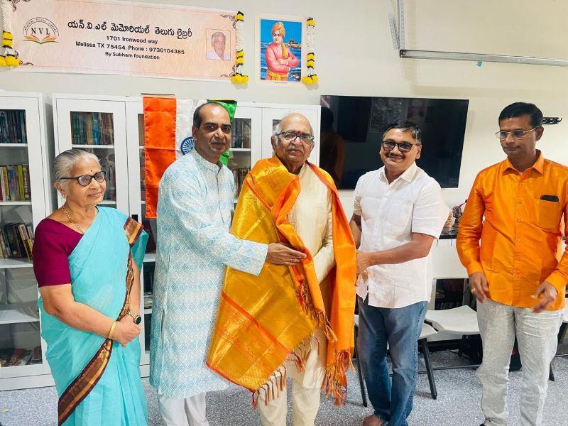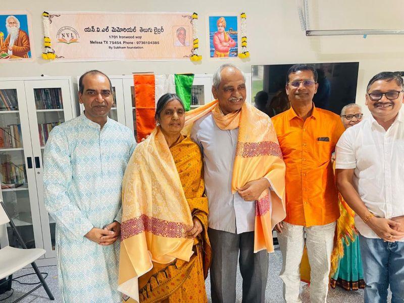 Later, prominent poet Dr. Balluri Umadevi donated her own writings to the library and spoke at the event. Another noted writer, Sindhumadhuri, announced that she would donate more than 2,000 valuable books from her collection to the NVL Library. Shubham Foundation director Vijay Tadapaneni, TANA representative Malli Vemana, renowned doctors Dr. Vijay Kathari and Dr. Phani, poet Jandhyala Srinath, retired headmaster Purushottam Reddy, Bharat, Venkat Cherukuri, Avaneendra Linga, Kiran Muvva, and Nagaraju’s family members Sunita, Ganesh, Gayatri, Kavitha, and Gautam also attended. The guests were honored with shawls. Renowned poet Dr. Beeram Sundara Rao welcomed the guests and conducted the program. A large number of book lovers from various parts of Dallas attended the event.