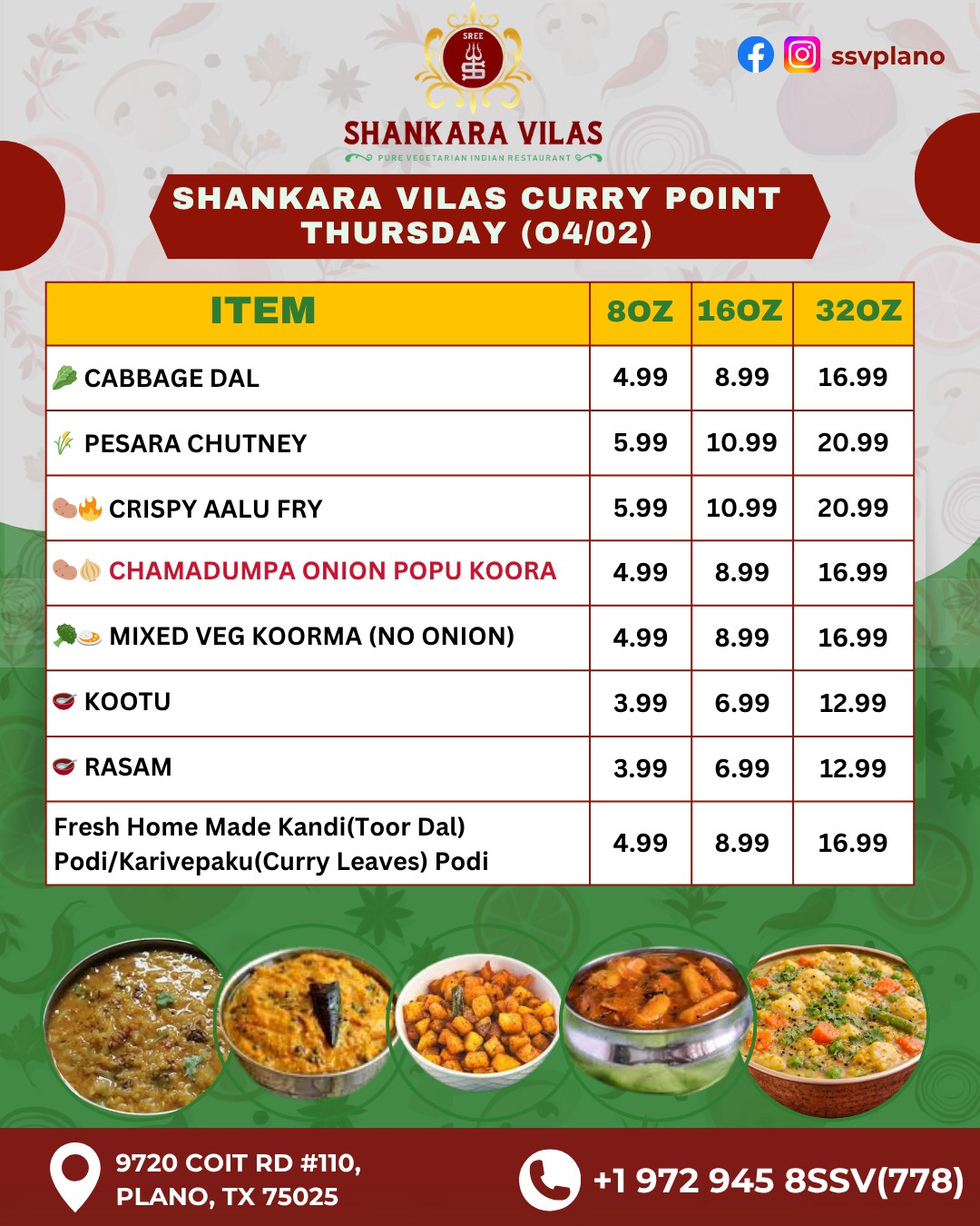 Craving delicious and fresh vegetarian Indian food? Shankara Vilas Curry Point offers an exciting Thursday menu that’s perfect for all curry lovers! Visit us in Plano for a variety of mouthwatering dishes, from flavorful dals to spicy Kootu and Rasam. Enjoy Chamadumpa Onion Popu Koora, Crispy Aalu Fry, and Mixed Veg Koorma in different portion sizes, so you can pick just the right amount of food for your appetite!