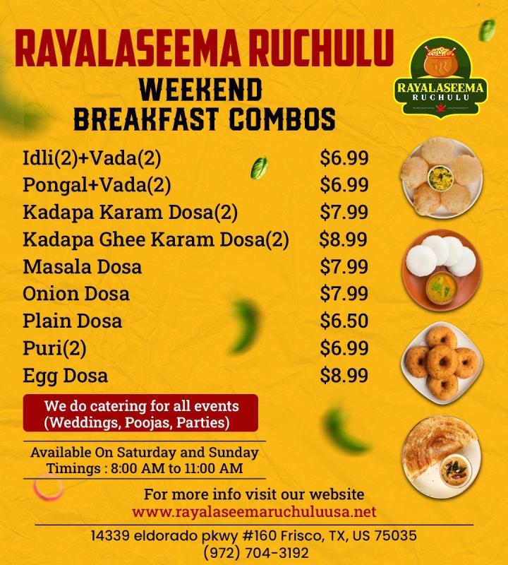 We offer catering services for all occasions (Weddings, Poojas, Parties) Available every Saturday and Sunday from 8:00 AM to 11:00 AM.