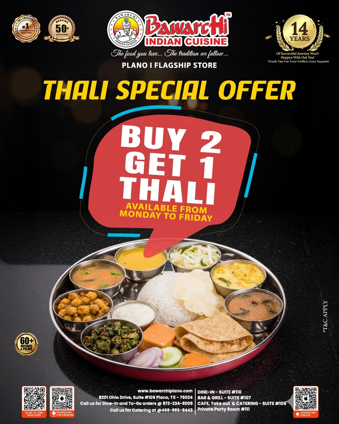 Indulge in the true flavors of India with Bawarchi Indian Cuisine’s Thali Special Offer! Treat your taste buds to a complete and satisfying Indian meal — packed with authentic dishes, rich aromas, and homely flavors.