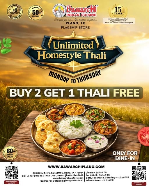 Treat yourself to a fulfilling and authentic Indian dining experience with Bawarchi’s Unlimited Homestyle Thali, now available with an exciting Buy 2 Get 1 FREE offer. Enjoy a variety of freshly prepared dishes served in a traditional thali, offering a perfect balance of flavors and comfort.