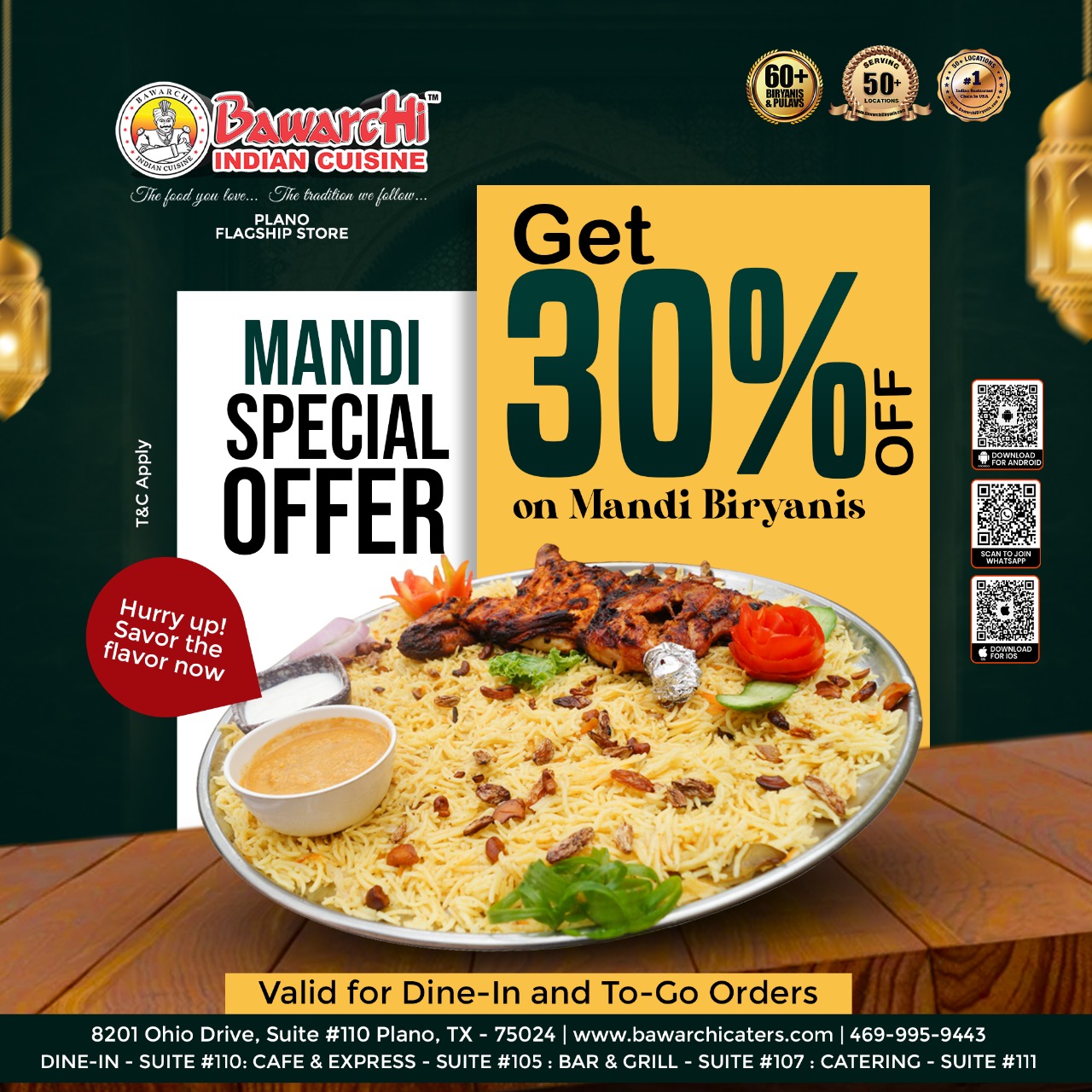 Craving delicious Mandi Biryani? Now is the perfect time to indulge! Bawarchi Indian Cuisine – Plano Flagship Store brings you an exclusive Mandi Special Offer – Get 30% OFF on Mandi Biryanis! 🍛✨