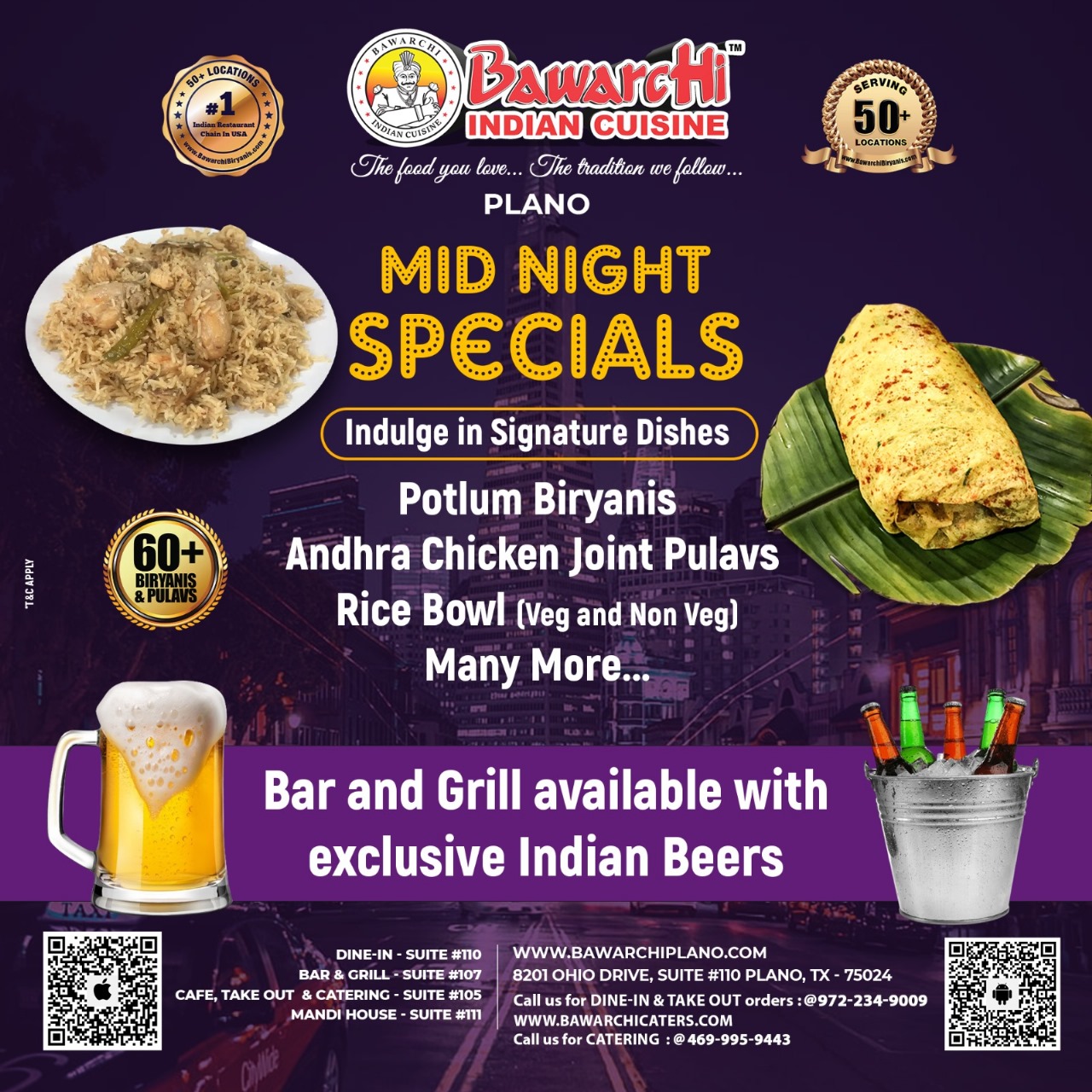 Satisfy your midnight cravings with Bawarchi Indian Cuisine – Plano! Enjoy our signature dishes and unwind with exclusive Indian beers at our Bar & Grill! 🍹✨