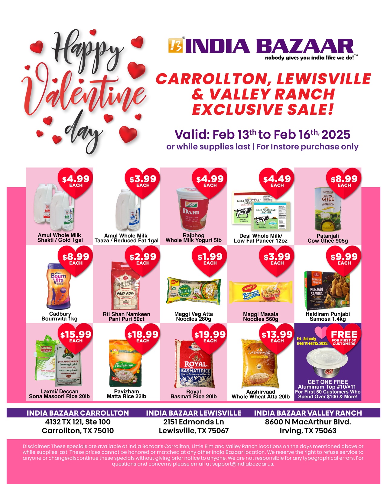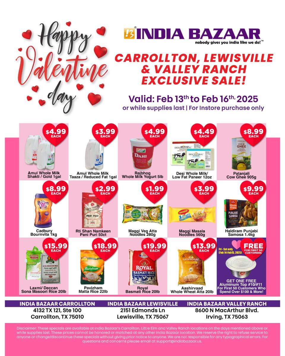 🛍️ Get ready for huge savings on your favorite Indian grocery items! Enjoy limited-time discounts at our Carrollton, Lewisville, and Valley Ranch locations from February 13th to February 16th, 2025.