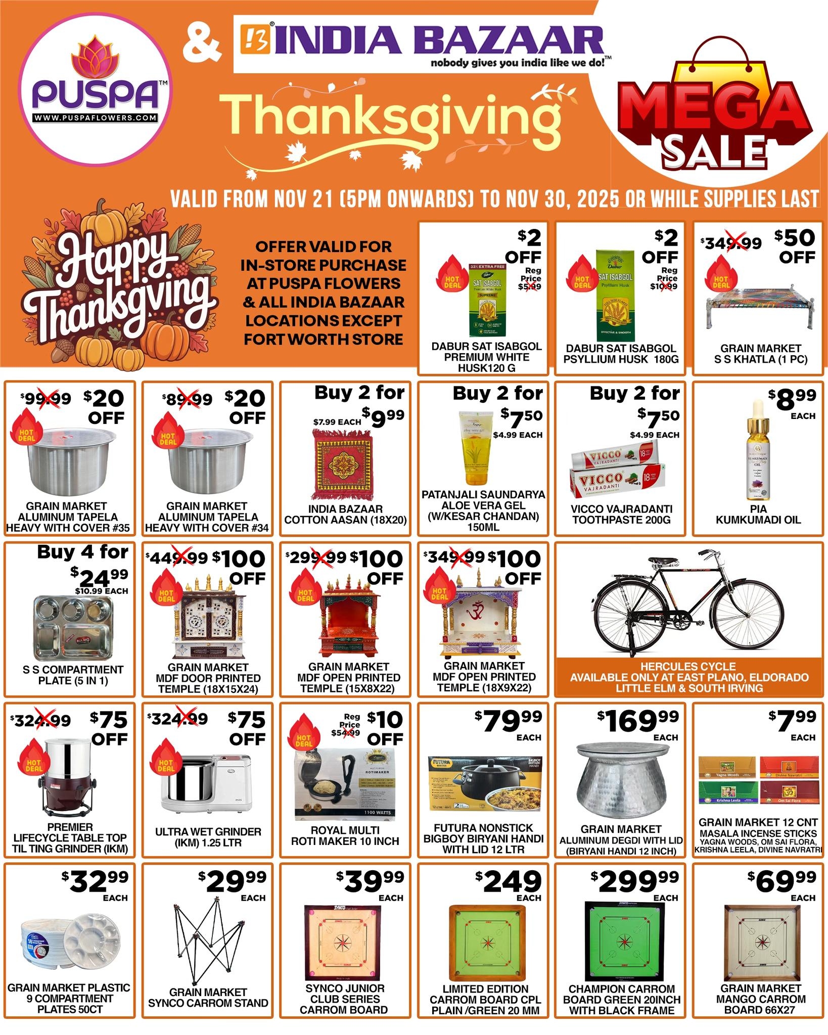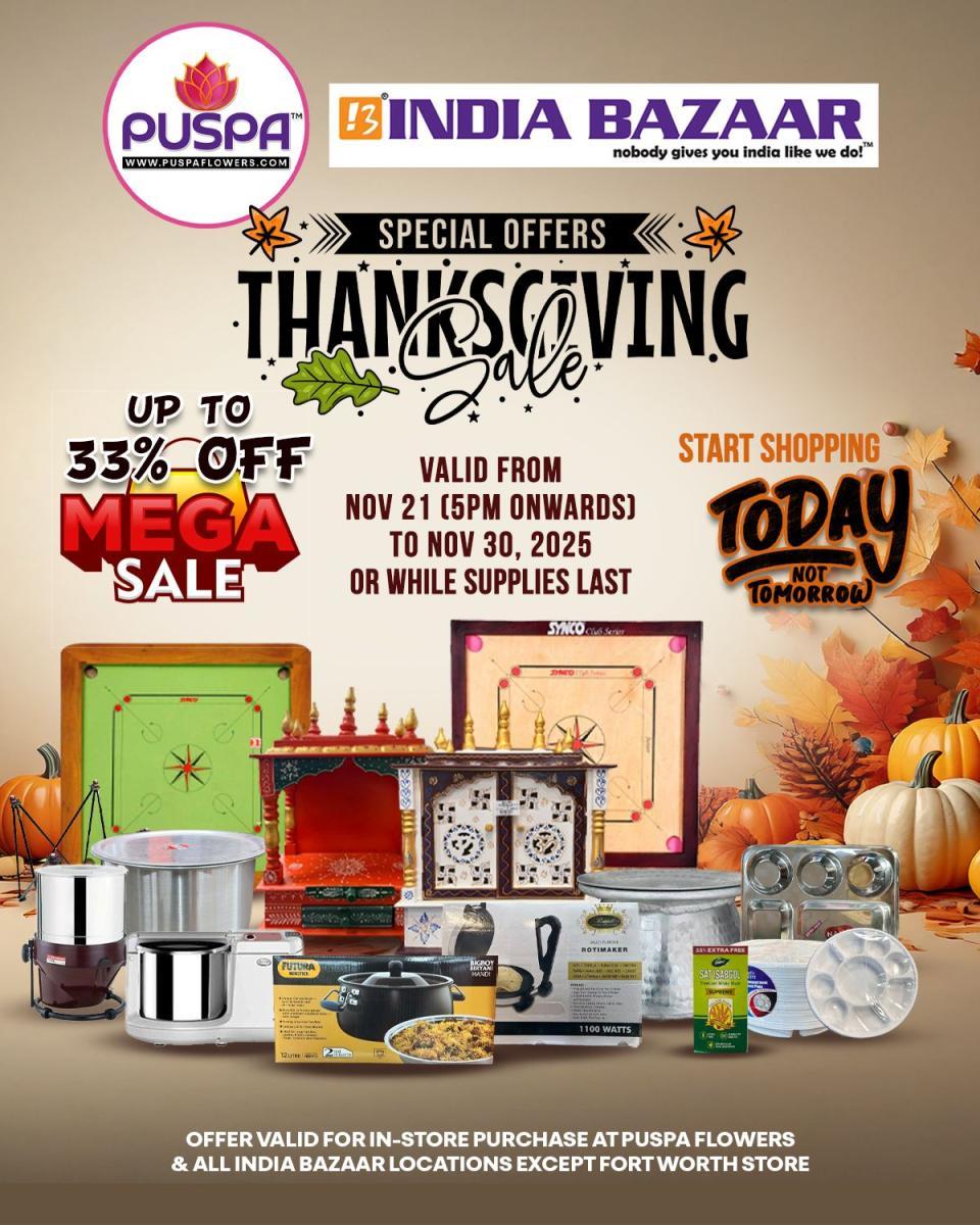 Celebrate this Thanksgiving season with the India Bazaar & Puspa Flowers Thanksgiving Mega Sale 2025, offering incredible savings for families across the USA. Enjoy a wide range of exclusive holiday discounts valid from November 21 (5 PM onwards) to November 30, 2025, available at all participating store locations except the Fort Worth branch.