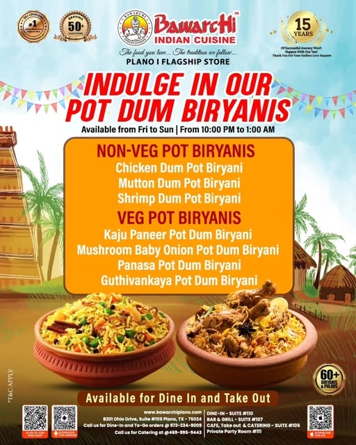 Indulge in the rich heritage of Indian culinary traditions at Bawarchi Indian Cuisine – Plano Flagship Store. Our special Pot Dum offerings are prepared using the authentic slow-cooking “Dum” technique, sealing in aroma, flavor, and tradition.
