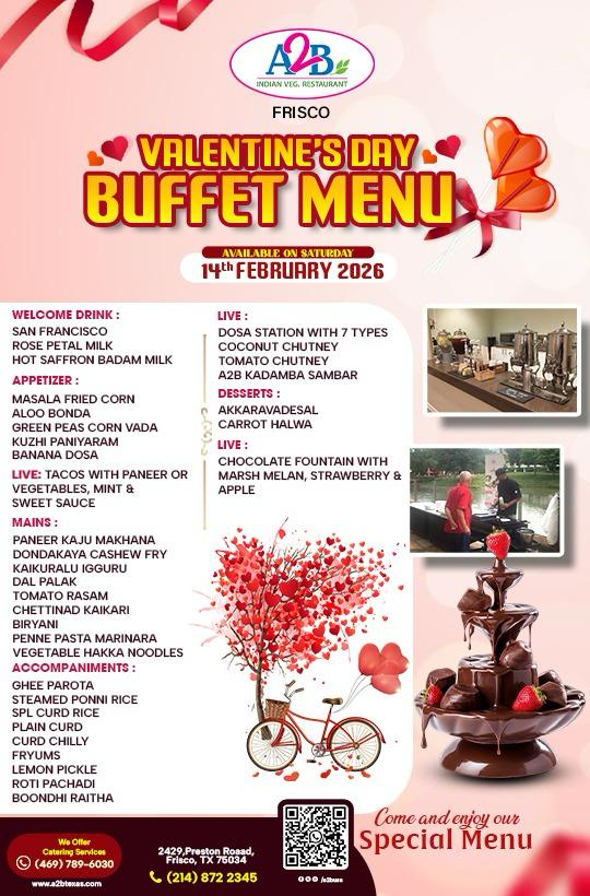 Celebrate love, food, and togetherness at A2B Indian Veg Restaurant – Frisco with a specially curated Valentine’s Day Buffet Menu featuring authentic Indian flavors and exciting live food stations.