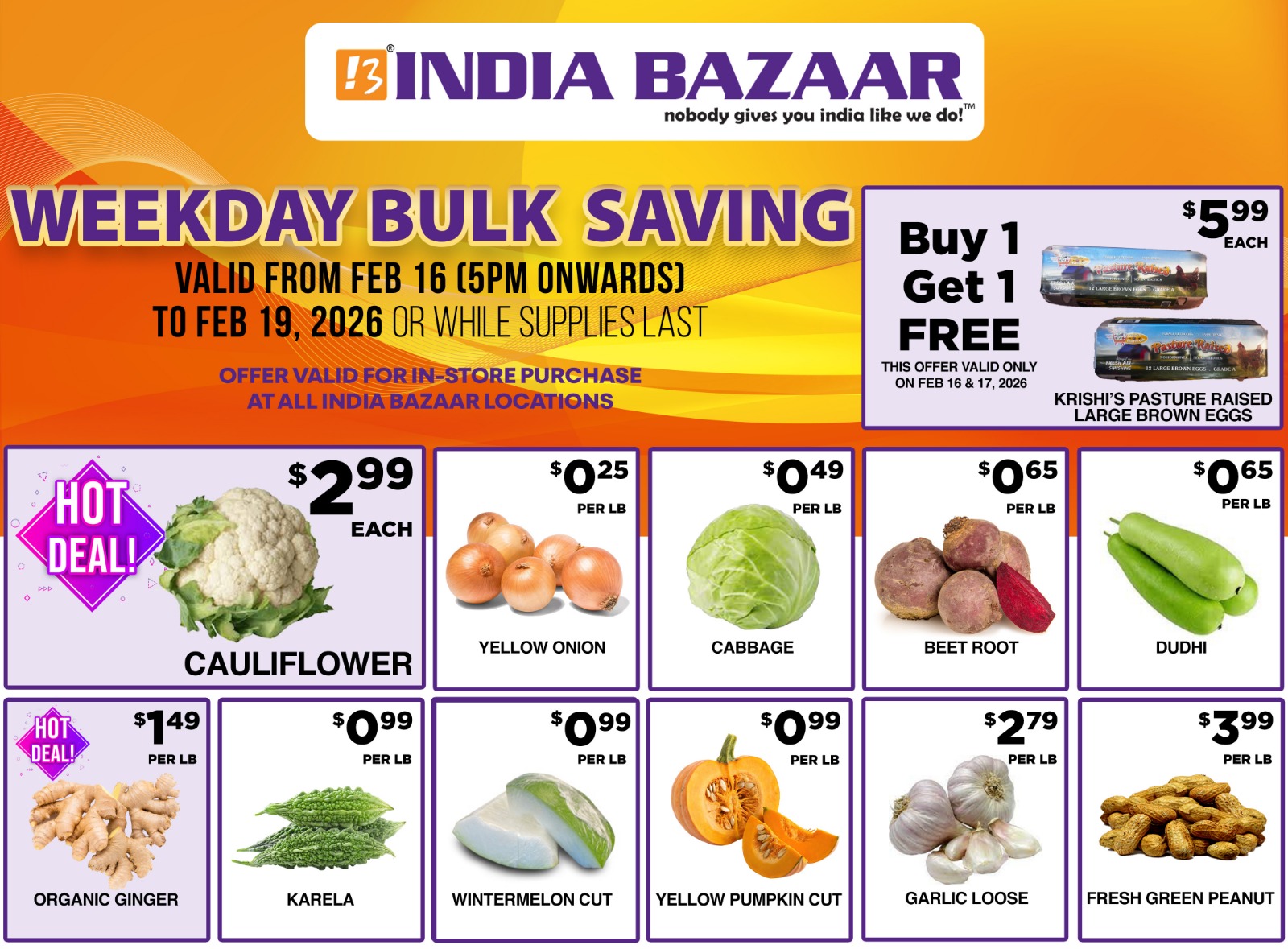 India Bazaar Weekday Bulk Saving Deals – Fresh Vegetables, Eggs & Grocery Offers (Feb 16–19, 2026)