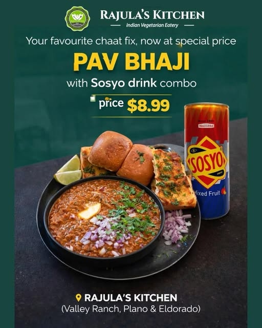 Rajula’s Kitchen – Pav Bhaji with Sosyo Drink Combo for $8.99 in Plano
