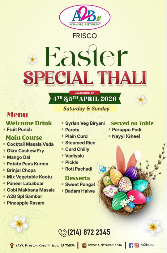 Celebrate Easter weekend with a grand Special Thali at A2B Indian Veg Restaurant, Frisco. Enjoy a rich spread of traditional vegetarian dishes, desserts, and authentic South Indian flavors served on Saturday and Sunday.