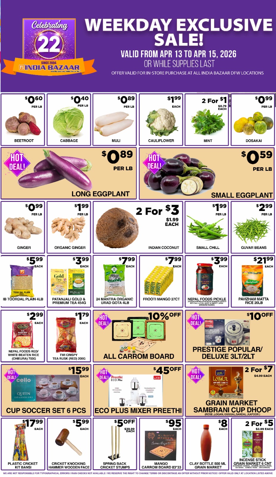 Celebrate savings at India Bazaar with our Weekday Exclusive Sale! From April 13 to April 15, 2026, enjoy incredible deals on fresh produce, groceries, and household essentials. Shop at any India Bazaar store in DFW for the best prices and limited-time offers. Whether you’re looking for beetroot, cauliflower, long eggplant, or special discounts on Frooti Mango and eco plus Preethi mixer, we’ve got you covered!
