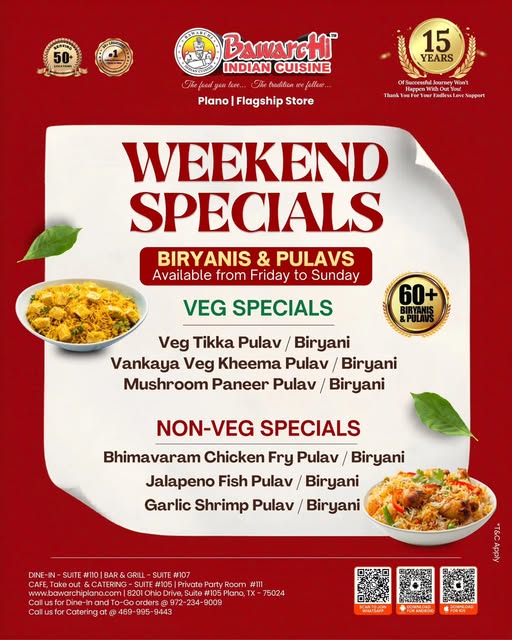 Make your weekends flavorful at Bawarchi Indian Cuisine – Plano Flagship Store with exclusive Biryani & Pulav Specials, available Friday through Sunday.