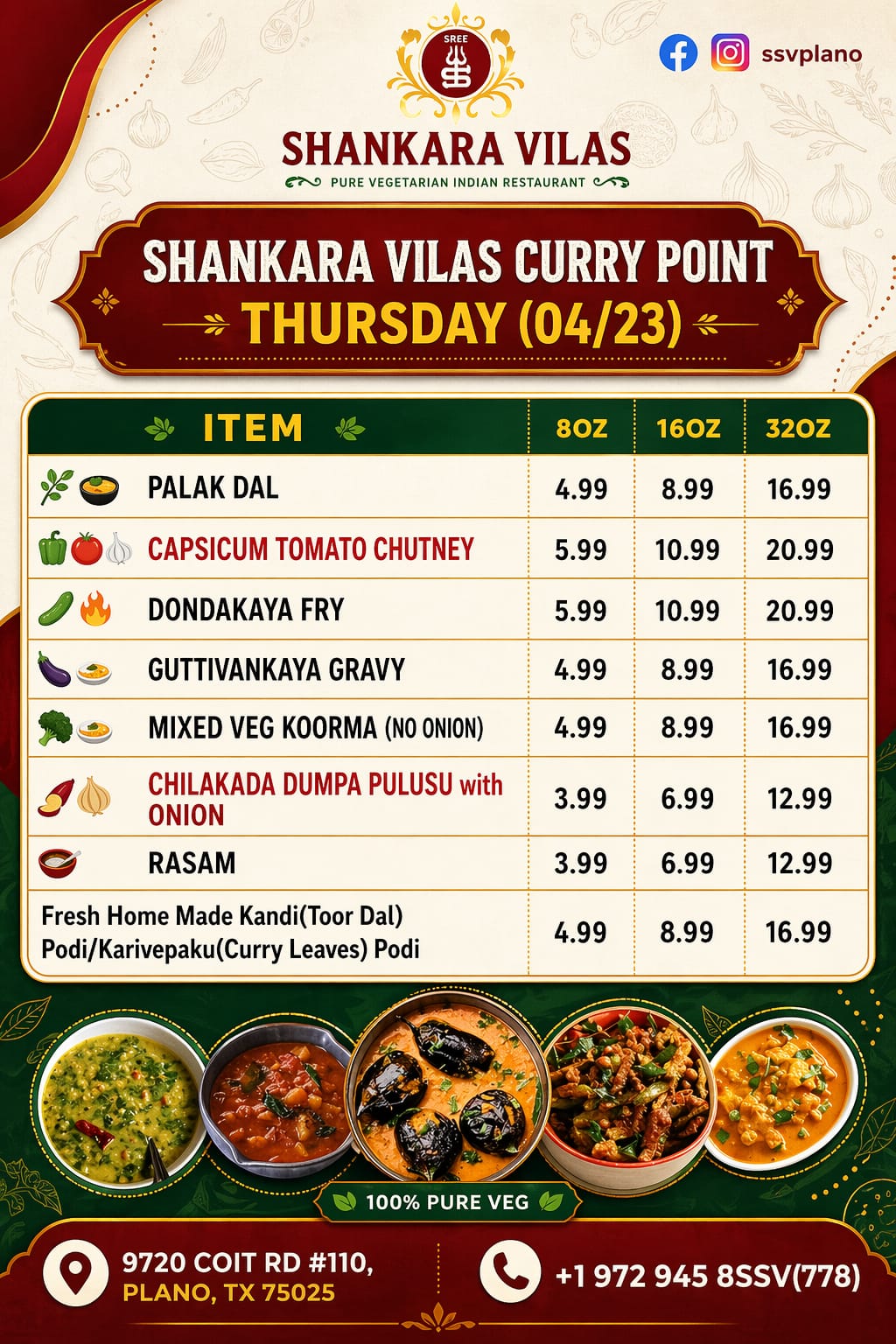 Craving authentic home-style Indian food in Plano? Shankara Vilas brings you a special Thursday Curry Point Menu, offering a wide variety of freshly prepared, 100% pure vegetarian dishes.Perfect for quick meals, family dinners, or takeout, the menu features delicious South Indian flavors made using traditional recipes and quality ingredients. You can choose from different portion sizes (8oz, 16oz, and 32oz), making it convenient for both individuals and families.