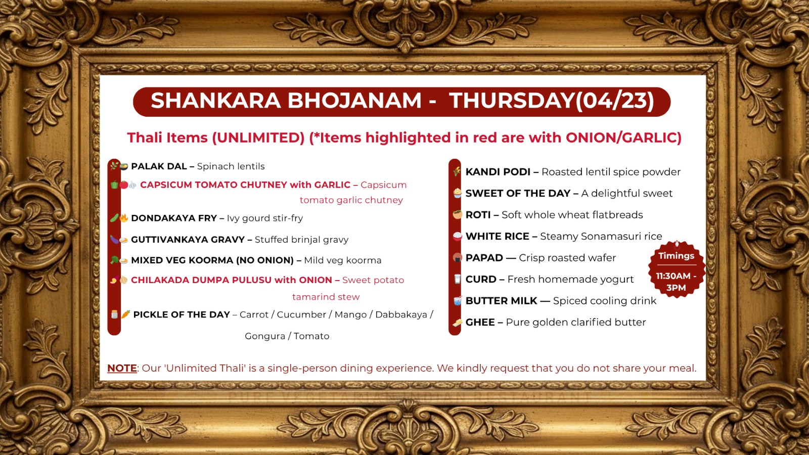 Experience the joy of a traditional Indian meal with Shankara Vilas Thursday Bhojanam, featuring a delicious Unlimited VegThali in Plano, Texas.This special dining experience brings together a wide variety of freshly prepared dishes served in a classic Indian thali style. Perfect for lunch, this offering is designed for those who love authentic, home-style vegetarian food.