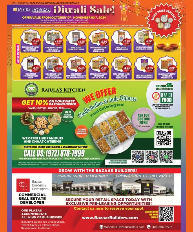 Celebrate Diwali with exclusive offers from India Bazaar and Rajula’s Kitchen! Enjoy discounts on groceries, catering services, and more.