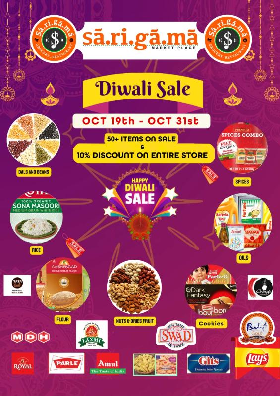 Celebrate this Diwali with amazing deals at Sā.r.i.g.ā.m.ā Marketplace! From October 19th to October 31st, enjoy discounts on over 50+ items and 10% off on the entire store! Shop your favorite groceries and festive essentials, including:
