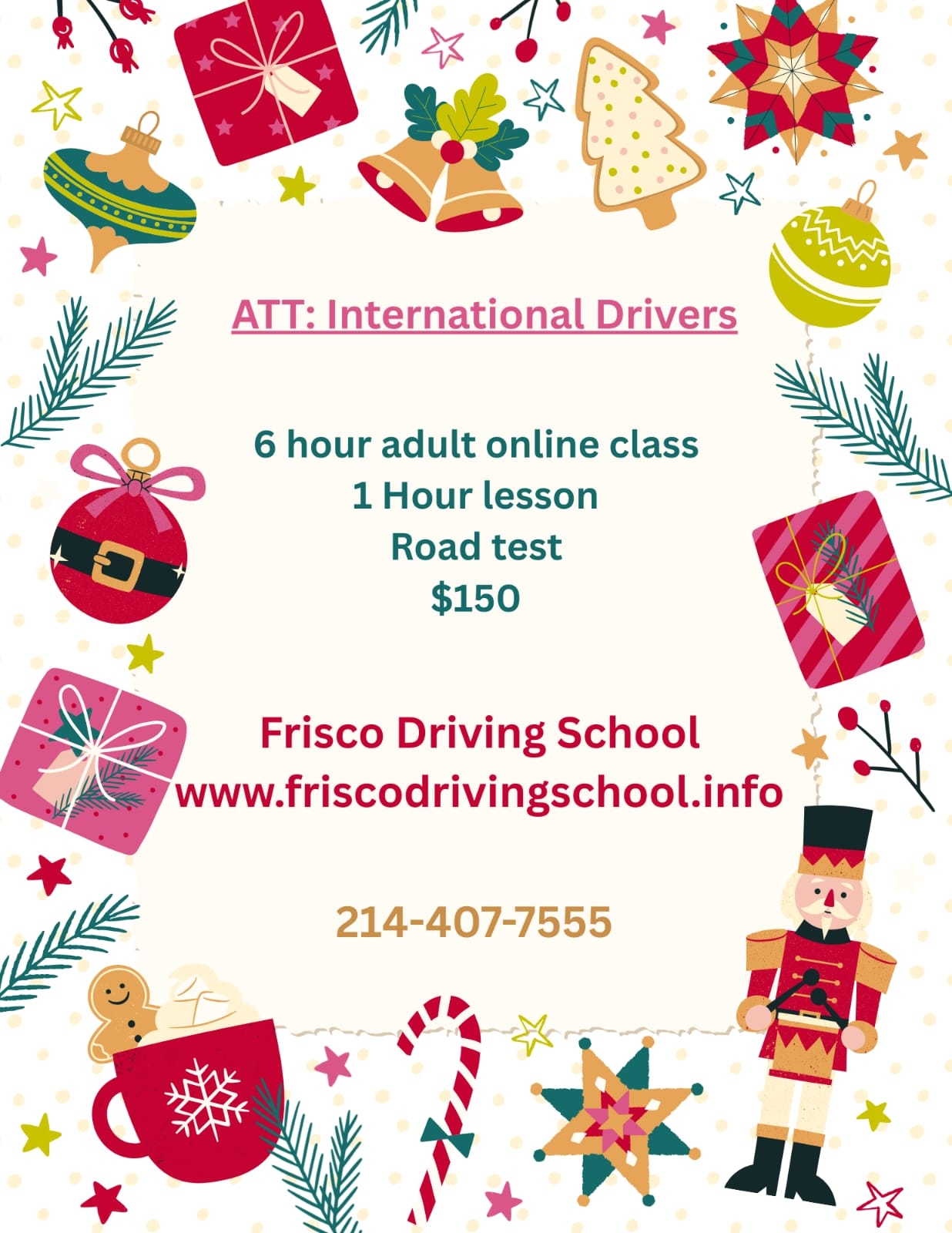 Frisco Driving School is offering a special driving package designed especially for new and international drivers in Texas. This deal includes a 6-hour online adult learning class, a 1-hour behind-the-wheel session, and a road test, all together for just $150.