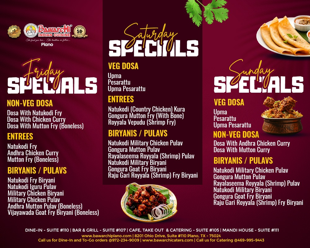 Craving authentic South Indian flavors? Bawarchi Indian Cuisine in Plano brings you a delicious lineup of Weekend Specials that celebrate tradition, spice, and unbeatable taste!