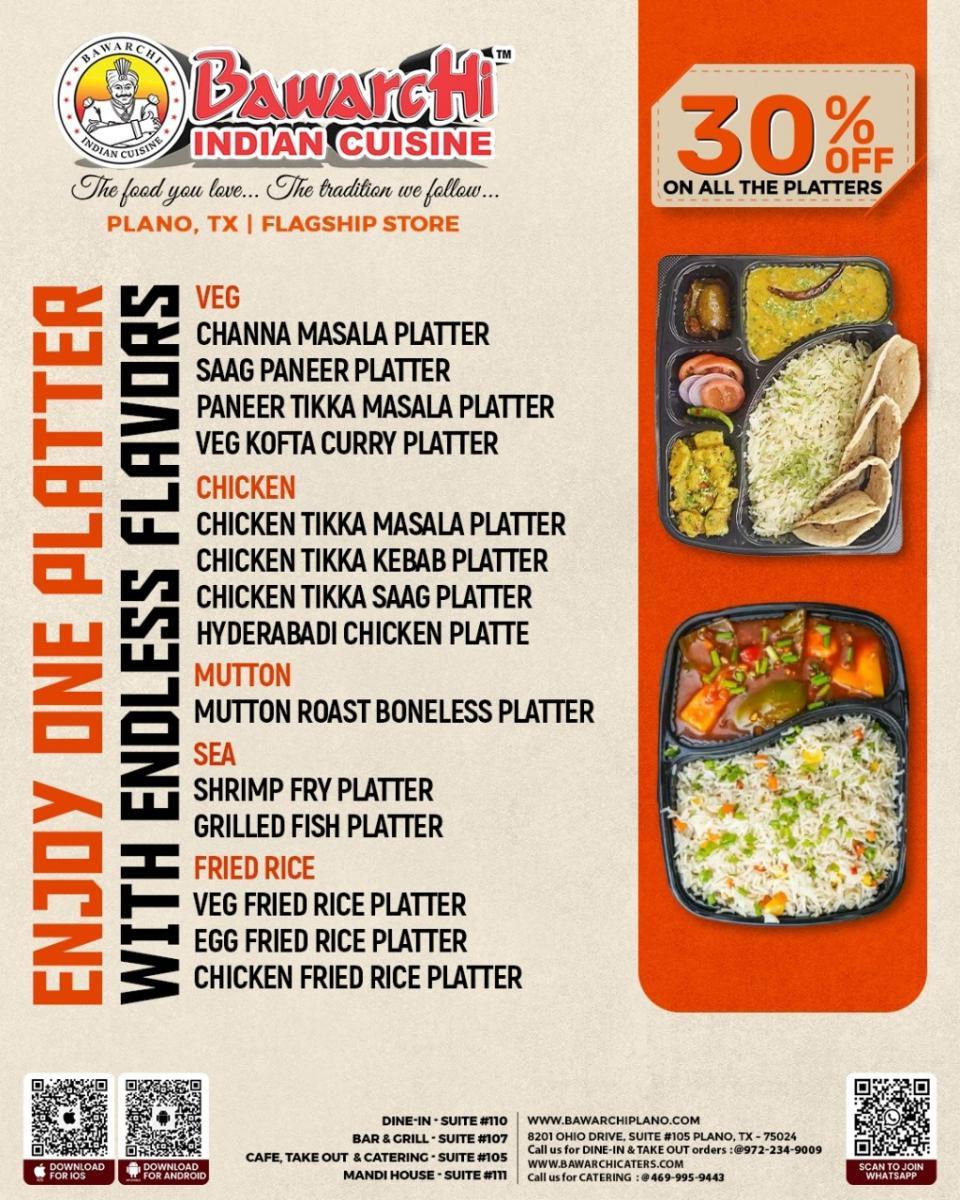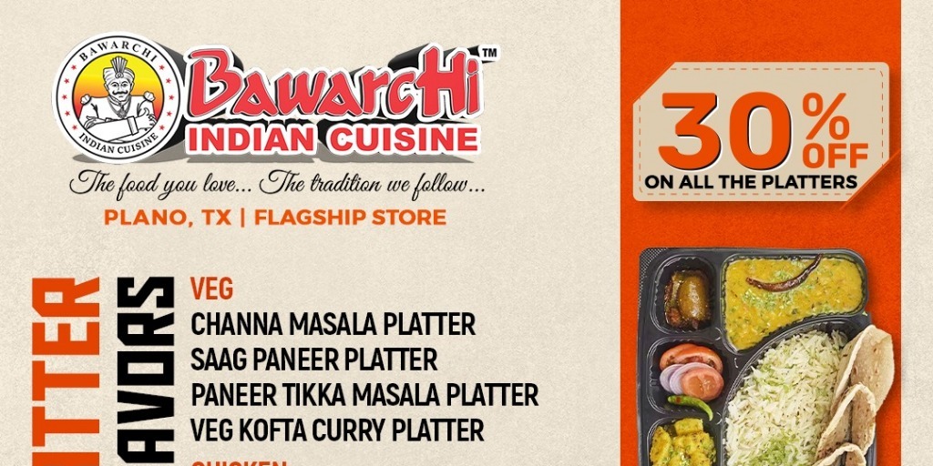 Bawarchi Indian Cuisine Plano: Get 30% Off on Veg, Chicken, Mutton & Seafood Platters – Limited Time Offer