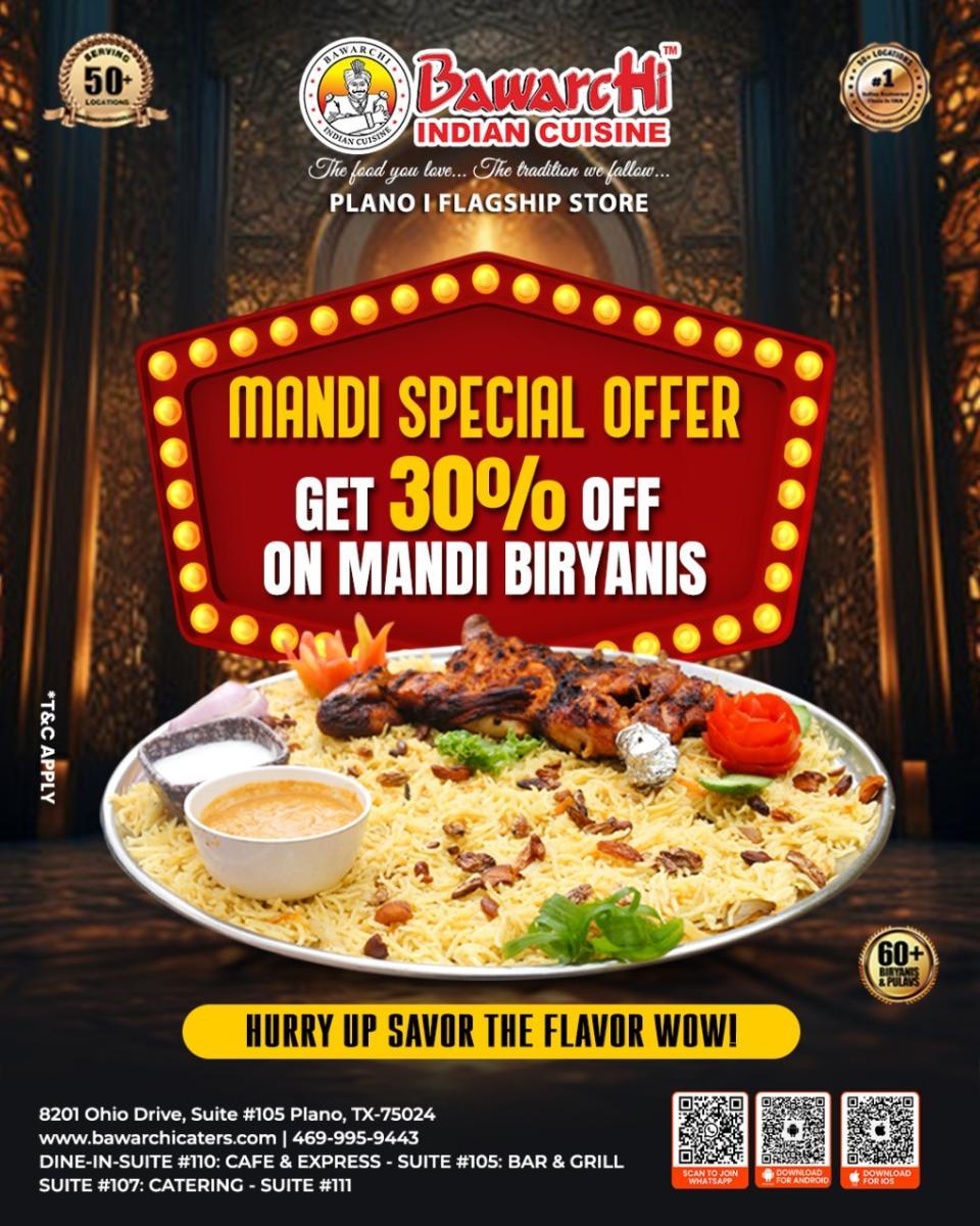 Spice up your meal with our flavorful Mandi Biryani — now at a 30% discount! This limited-time offer is available exclusively at Bawarchi Indian Cuisine’s Plano Flagship Store.