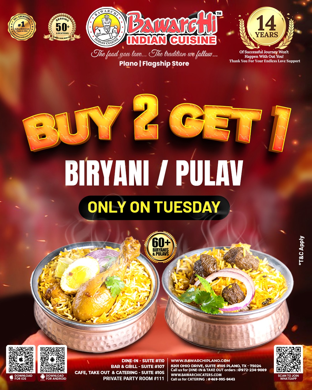 Make your Tuesdays extra flavorful with Bawarchi Indian Cuisine’s Buy 2 Get 1 Free Offer! 🍛