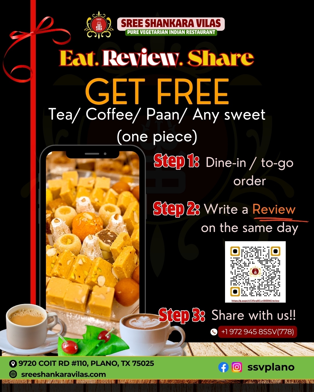 Enjoy a delicious reward at Sree Shankara Vilas with our special Eat. Review. Share. offer! When you dine in or place a to-go order, simply write a review on the same day and share it with us to receive a free treat as a thank-you for your support.