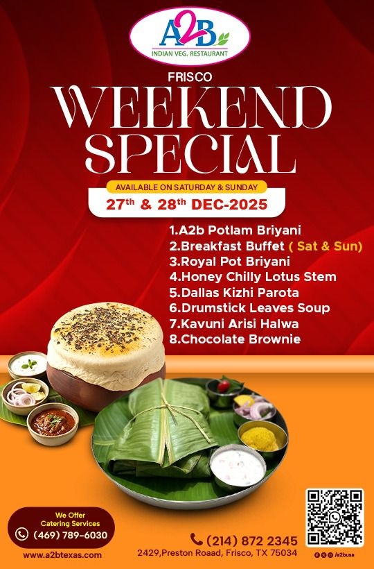 Enjoy a festive and flavorful weekend at A2B Indian Veg Restaurant – Frisco with our Weekend Special, available Saturday & Sunday, December 27th & 28th, 2025. This limited-time weekend offering brings together a delicious selection of traditional and contemporary vegetarian favorites, crafted with authentic spices and high-quality ingredients.