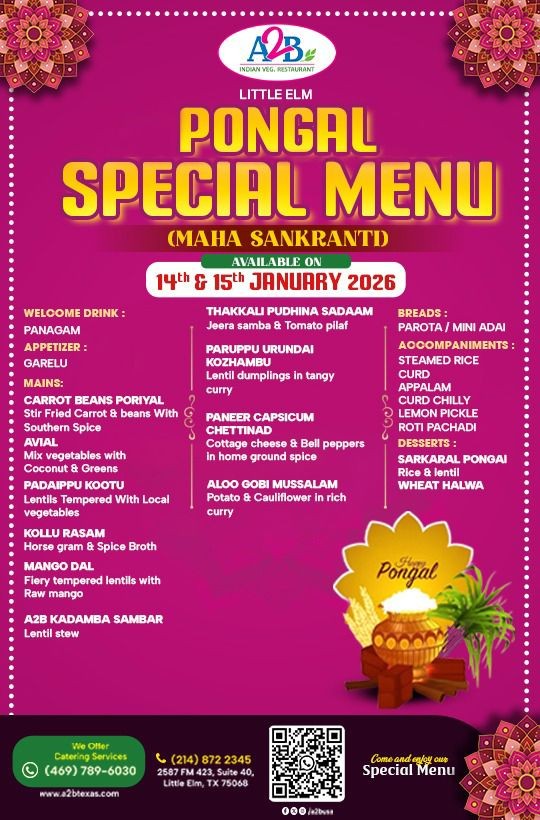 Celebrate Maha Sankranti 2026 at A2B Indian Veg Restaurant, Little Elm with our exclusive Pongal Special Menu, available on January 14th and 15th, 2026.