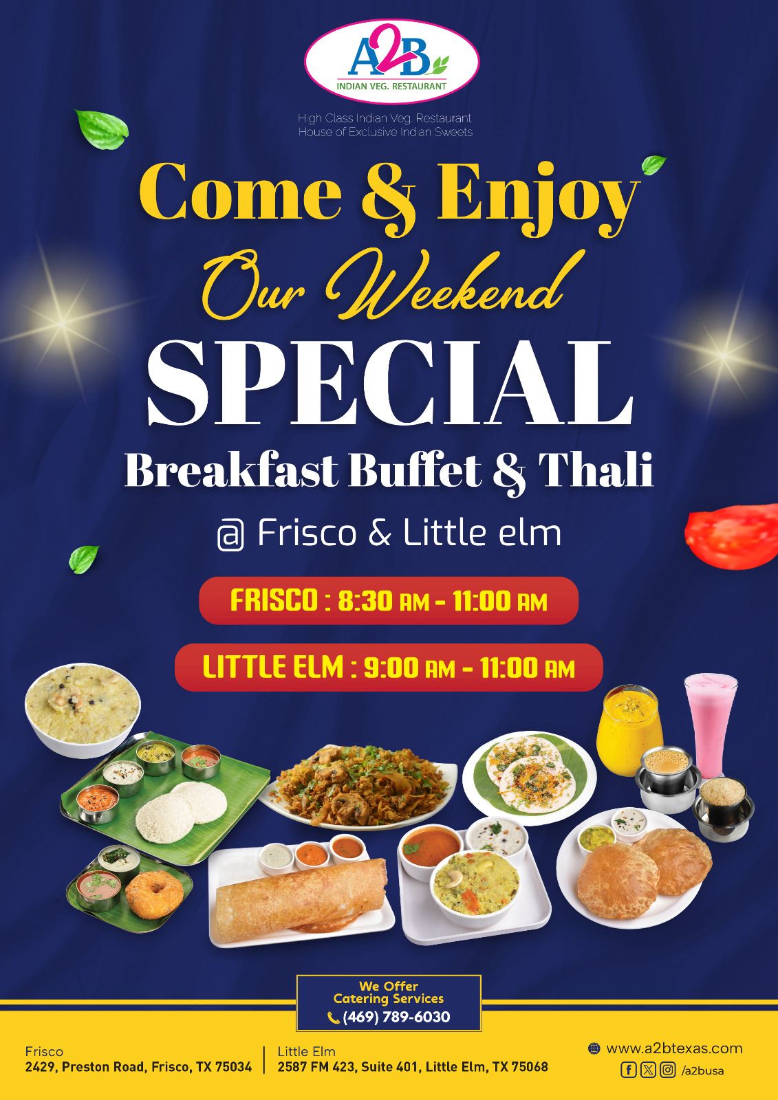 Treat yourself and your family to a delicious Weekend Special Breakfast Buffet & Thali at A2B Indian Veg Restaurant, available every weekend at our Frisco and Little Elm locations.