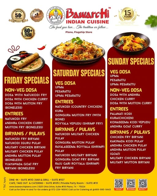 Looking for authentic Indian food in Plano? Bawarchi Indian Cuisine brings you mouthwatering Friday, Saturday, and Sunday specials featuring a wide variety of vegetarian and non-vegetarian dishes crafted with traditional spices and rich flavors.