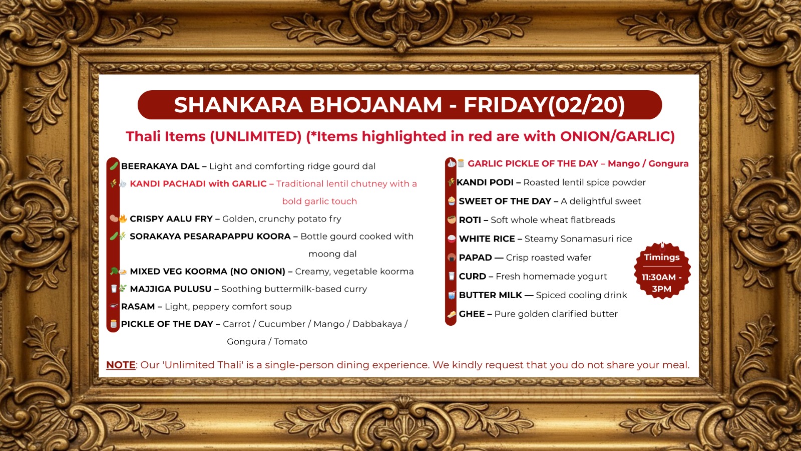 Note: Unlimited thali is a single-person dining experience and meals are not shareable.