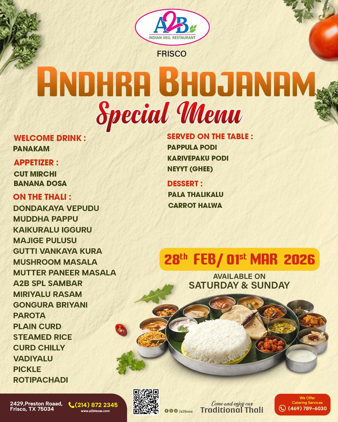 Experience the rich flavors of Andhra cuisine with the Andhra Bhojanam Special Menu at A2B Indian Veg Restaurant. This exclusive weekend special brings a traditional Andhra-style vegetarian thali prepared with authentic recipes and fresh ingredients, offering a complete homestyle dining experience.