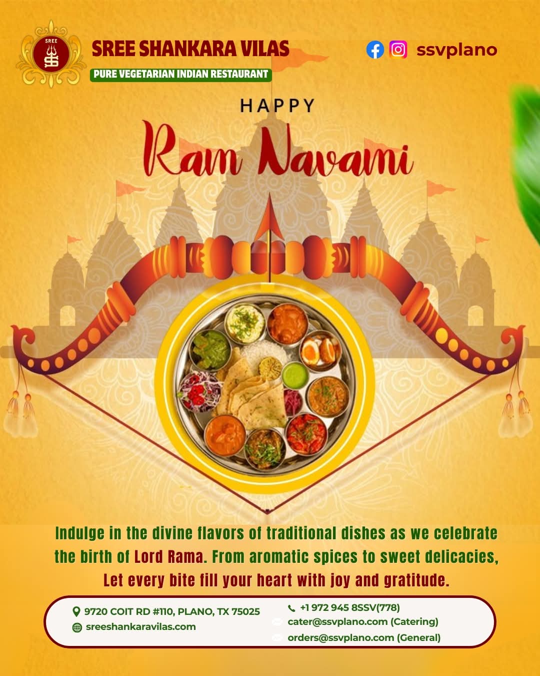 Whether you are planning a family meal, festive gathering, or catering for a special occasion, Sree Shankara Vilas offers the perfect blend of taste and tradition. Experience the warmth of Indian hospitality and celebrate the birth of Lord Rama with a wholesome and delicious vegetarian feast.