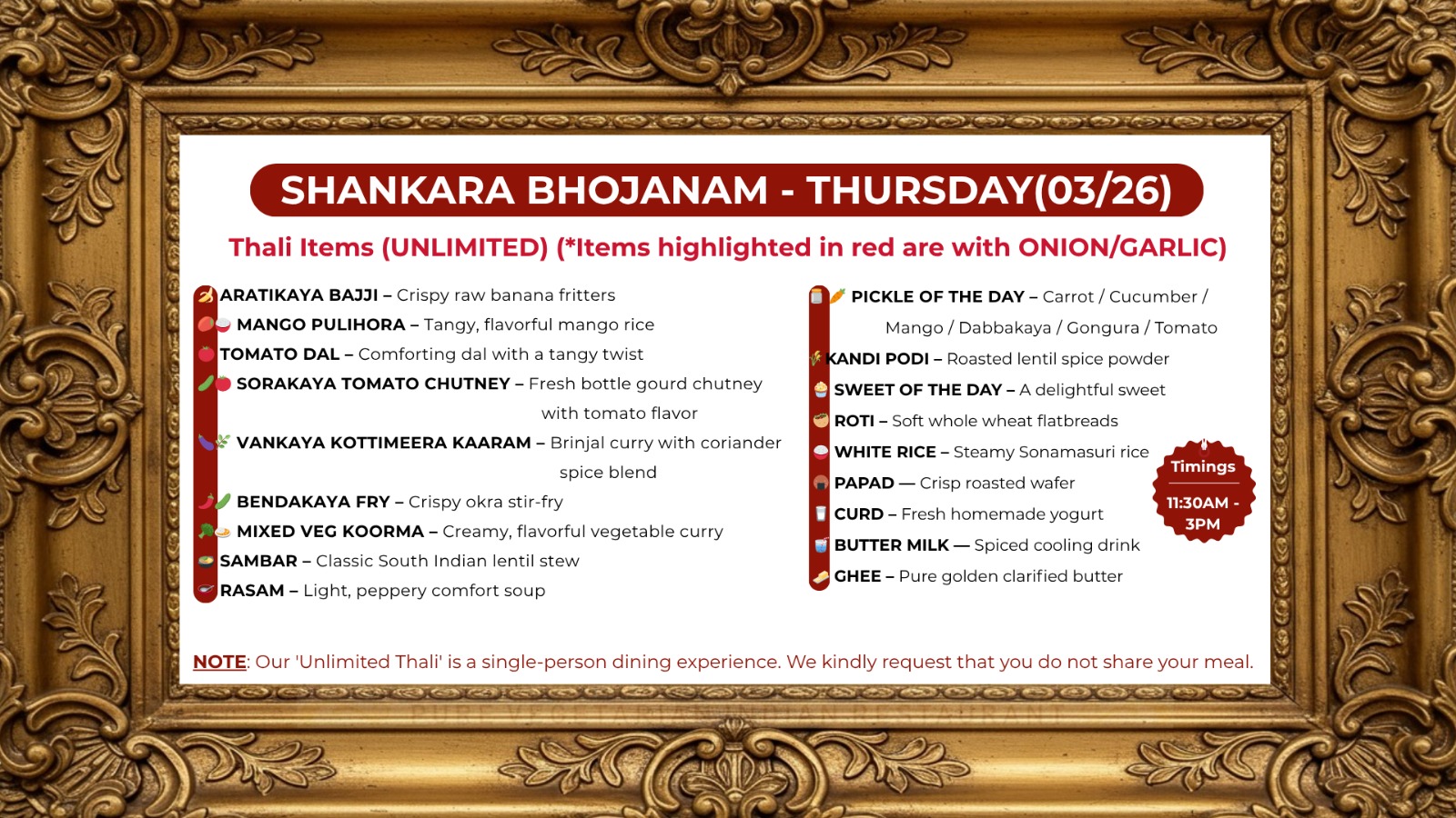 Experience the richness of traditional South Indian cuisine with the Unlimited Shankara Bhojanam Thali at Sree Shankara Vilas, Plano TX. This special Thursday offering brings you a wholesome and satisfying meal with a wide variety of authentic vegetarian dishes prepared fresh with rich flavors and traditional recipes.