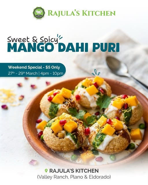 Treat your taste buds to a burst of flavors with the Sweet & Spicy Mango Dahi Puri Weekend Special at Rajula’s Kitchen. This delicious Indian street food favorite combines crispy puris filled with tangy chutneys, creamy yogurt, fresh mango chunks, and a perfect balance of sweet and spicy flavors that create a refreshing and irresistible snack.