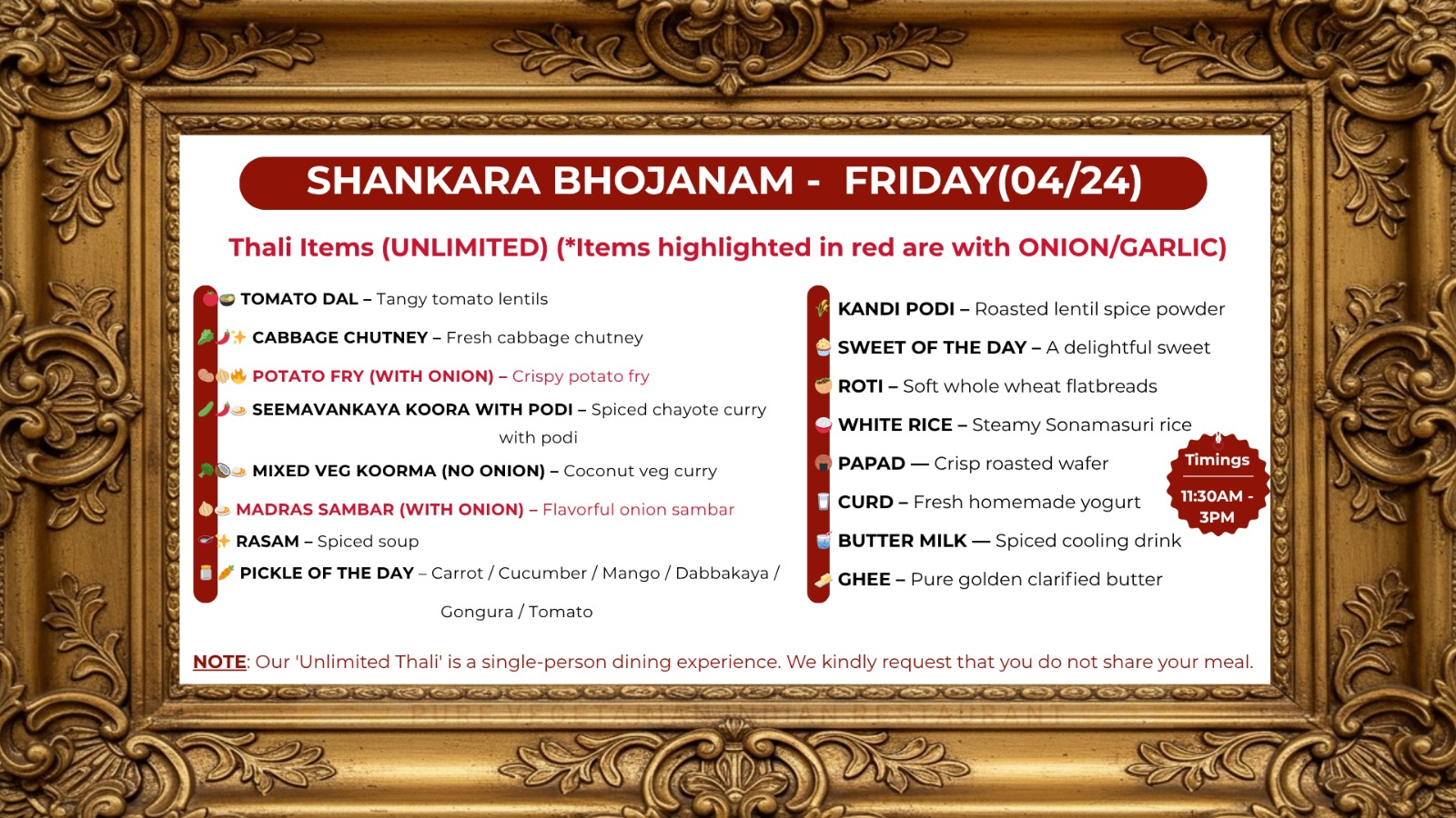 Looking for a wholesome and authentic Indian meal in Plano? Experience Shankara Vilas Friday Bhojanam, offering a delicious Unlimited Veg Thali that brings the taste of traditional South Indian dining to your table.This special thali is crafted with a variety of freshly prepared dishes, served unlimited for a complete and satisfying lunch experience.