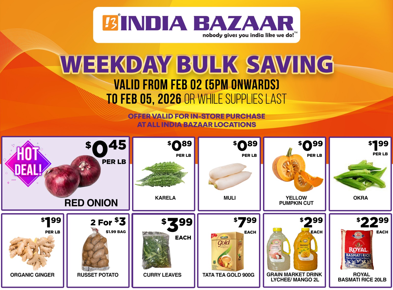 India Bazaar brings you unbeatable Weekday Bulk Saving Deals to help you stock up and save more on your everyday grocery needs. This limited-time in-store offer is available across all India Bazaar locations and features special pricing on fresh produce and essential grocery items.