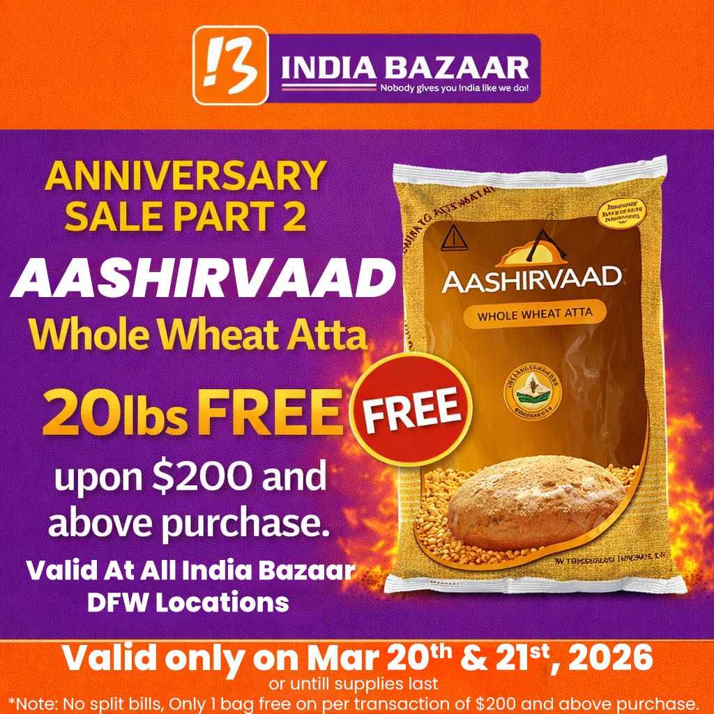 This limited-time promotion features Aashirvaad Whole Wheat Atta, a top-quality wheat flour, available for FREE when you spend $200 or more. That’s right, get 20lbs of Aashirvaad Whole Wheat Atta absolutely FREE with any purchase of $200 or above at India Bazaar locations in the DFW region.