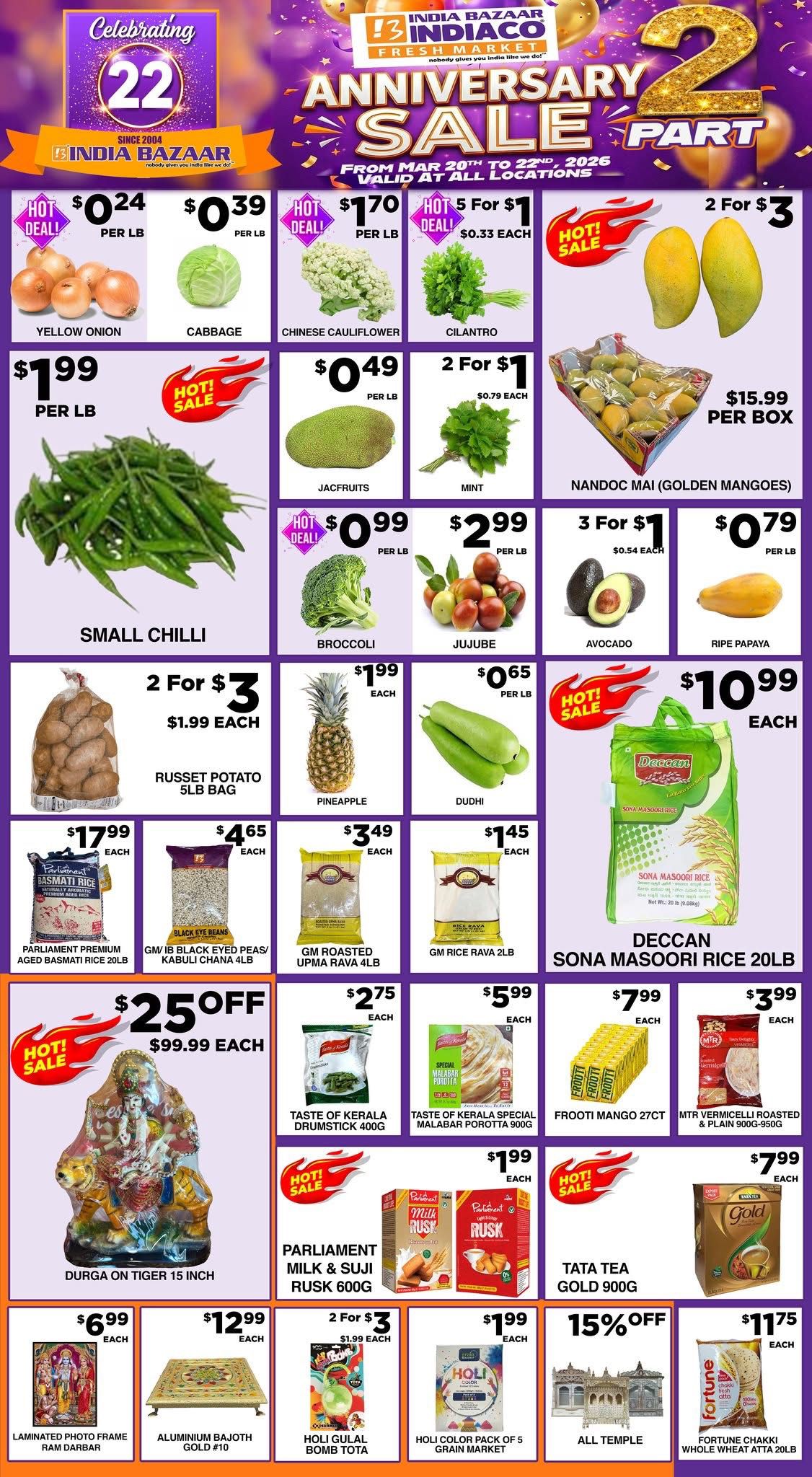 India Bazaar is celebrating its Anniversary Sale Part 2 with massive discounts across all locations! From March 20th to March 22nd, 2026, you can find unbeatable prices on a wide range of grocery essentials, fresh produce, and more. Whether you're looking for Aashirvaad Whole Wheat Atta, Deccan Sona Masoori Rice, or fresh fruits like Nandoc Mai Mangoes, Pineapple, and Jackfruits, this sale has something for everyone!