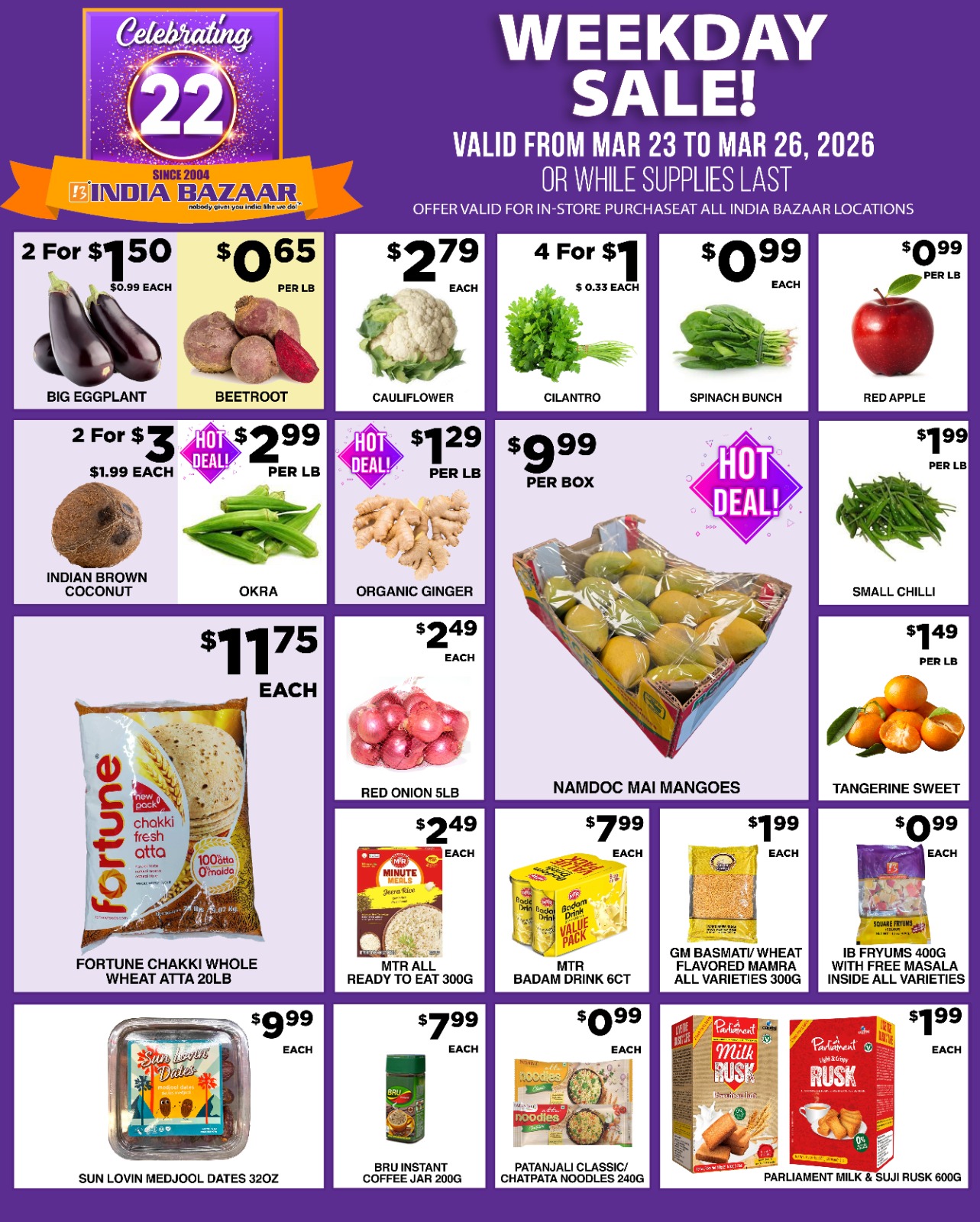 India Bazaar is celebrating its Weekday Sale with incredible savings across fresh produce, groceries, and household essentials. From March 23 to March 26, 2026, customers can enjoy limited-time offers available at all store locations while supplies last.