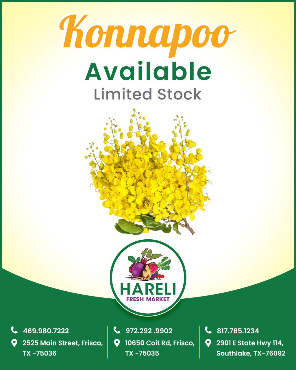 Hareli Fresh Market is excited to offer Konnapoo in limited stock! Whether you’re preparing for Pooja or other Indian cultural rituals, our fresh konnapoo is the perfect choice for your needs. This fragrant and beautiful flower is now available at our Frisco and Southlake locations.